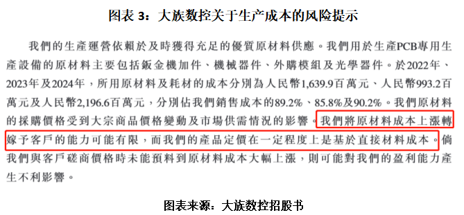 与之类似,2023—2024年,大族数控曝光设备的销售成本同比变动率分别为-9.80%、1.80%,而平均售价的同比变动率分别为-21.71%、0.84%。在招股书中,大族数控也表示,该公司的产品定价在一定程度上是基于直接材料成本,而其将原材料成本上涨转嫁予客户的能力可能有限。