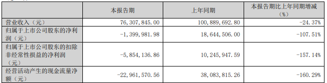 2025年第一季度,公司实现营业收入7630.78万元,同比减少24.37%;归属于上市公司股东的净利润-1399.98万元,上年同期为1864.45万元;归属于上市公司股东的扣除非经常性损益的净利润-585.41万元,上年同期为1024.59万元;经营活动产生的现金流量净额-2296.16万元,上年同期为3808.38万元。