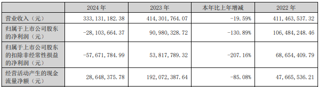 2024年,诚达药业实现营业收入3.33亿元,同比减少19.59%;归属于上市公司股东的净利润-2810.37万元,上年同期为9098.03万元;归属于上市公司股东的扣除非经常性损益的净利润-5767.18万元,上年同期为5381.78万元;经营活动产生的现金流量净额2864.84万元,同比减少85.08%。