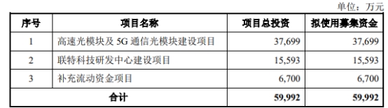 联特科技本次发行募集资金总额为人民币72,746.74万元,实际募集资金净额为人民币65,756.25万元,较原计划多5,764.25万元;公司2022年8月29日披露招股书显示,公司拟募集资金59,992万元,计划用于高速光模块及5G通信光模块建设项目、联特科技研发中心建设项目、补充流动资金项目。