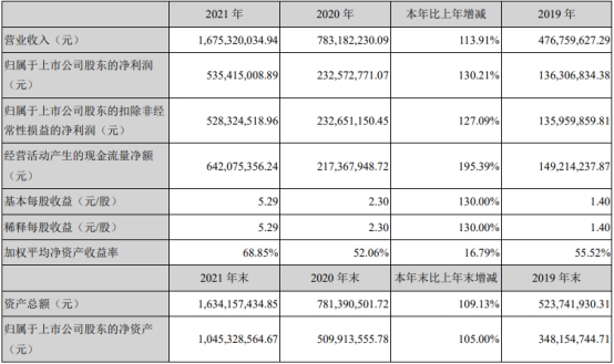 2022年4月27日,三元生物发布2021年年度报告,公司2021年营业收入为16.75亿元,同比增长113.91%;归属于上市公司股东的净利润为5.35亿元,同比增长130.21%;归属于上市公司股东的扣除非经常性损益的净利润为5.28亿元,同比增长127.09%;经营活动产生的现金流量净额为6.42亿元,同比增加195.39%。