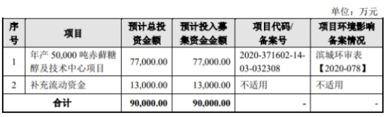 三元生物于2022年1月28日披露的招股说明书显示,公司拟募集资金9.00亿元,分别用于年产50000吨赤藓糖醇及技术中心项目、研发信息中心建设项目、补充流动资金。