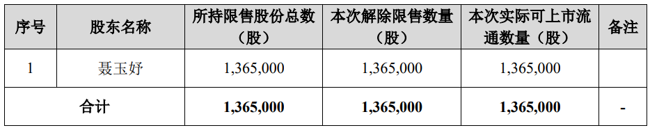 本次申请解除股份限售的股东共计1名,为聂玉妤。本次解除限售股份的数量为1,365,000股,占公司总股本的0.67%,限售股上市流通日期为2025年2月10日。