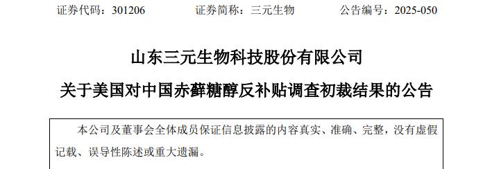 日前,美国商务部公布了对原产于中国的赤藓糖醇产品反倾销和反补贴调查结果,三元生物(301206.SZ)适用3.49%的反补贴税,中国其他生产商/出口商的税率为3.47%。