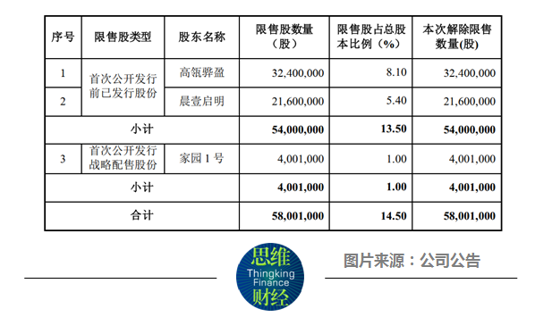 2月15日发布的公告显示,华兰疫苗本次解除限售的股份包括两部分,IPO前已发行的股份数量为5400万股,占总股本13.5%,涉及股东2个,分别为高瓴骅盈、晨壹启明;IPO战略配售的股份数量为400.1万股,占总股本1%,涉及股东为家园1号。