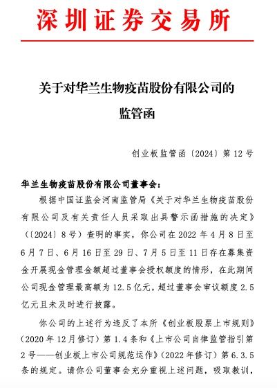 监管函称,根据中国证监会河南监管局《关于对华兰生物疫苗股份有限公司及有关责任人员采取出具警示函措施的决定》(〔2024〕8号)查明的事实,华兰疫苗在2022年4月8日至6月7日、6月16日至29日、7月5日至11日存在募集资金开展现金管理金额超过董事会授权额度的情形,在此期间公司现金管理最高额为12.5亿元,超过董事会审议额度2.5亿元且未及时进行披露。