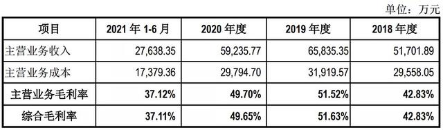 毛利率方面,2018年到今年上半年主营业务毛利率分别为42.83%、51.52%、49.70%和37.12%。