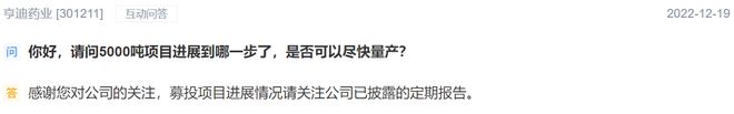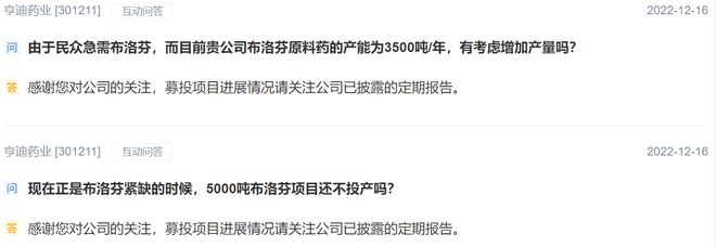 现在布洛芬急缺,亨迪药业这5000吨的新产能无疑被寄予厚望,被投资者反复提及。在互动易平台,就不断有投资者询问项目的进展、何时投产。