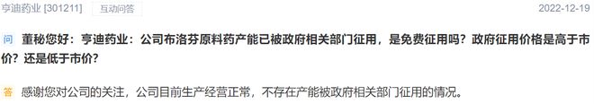 之前有媒体报道亨迪药业称公司的布洛芬原料药已全部被政府征用,但12月19日亨迪药业方面回应称“不属实”,这波“征与未征”成为疑云。