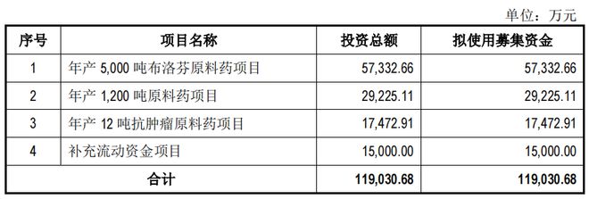 去年上市前的招股书披露,亨迪药业有三大募投项目,年产5000 吨布洛芬原料药项目投资额最高。