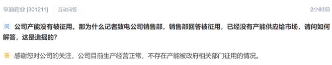 12月20日,有投资者在互动易追问征用是否是造谣,亨迪药业回应称“公司目前生产经营正常,不存在产能被政府相关部门征用的情况。”