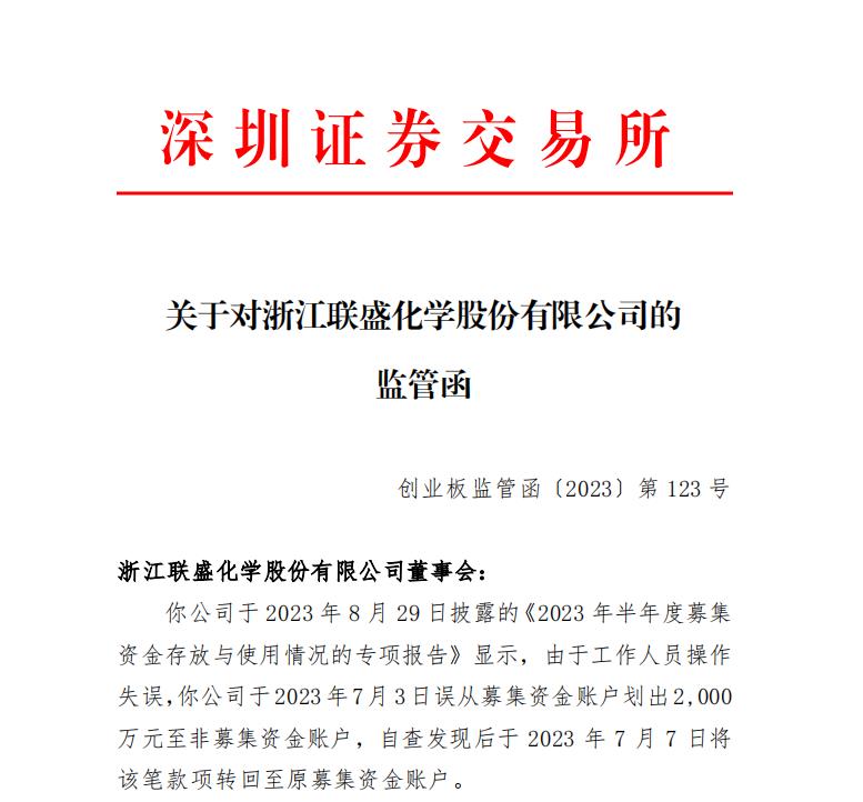 监管函显示,联盛化学于2023年8月29日披露的《2023年半年度募集资金存放与使用情况的专项报告》显示,由于工作人员操作失误,公司于2023年7月3日误从募集资金账户划出2000万元至非募集资金账户,自查发现后于2023年7月7日将该笔款项转回至原募集资金账户。
