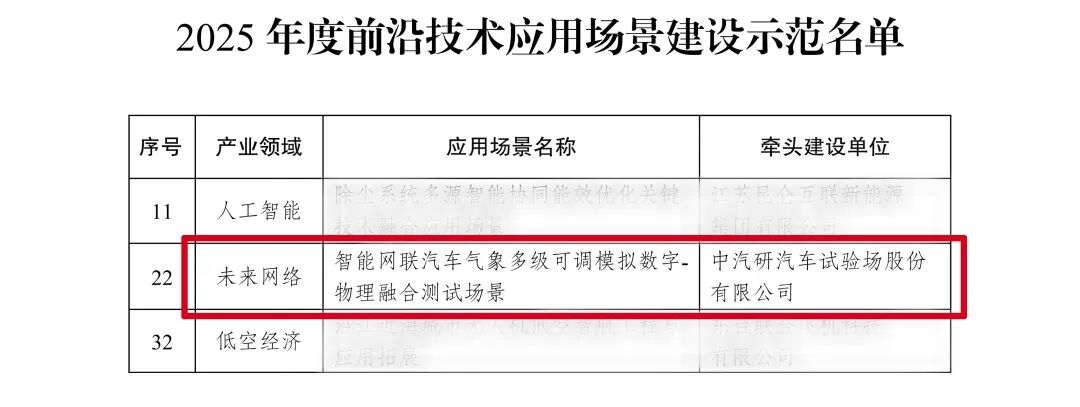 近日,江苏省科技厅、江苏省发展改革委联合公布《2025年度前沿技术应用场景建设示范名单》,涵盖前沿技术应用场景共49项、15个技术领域,中汽股份“智能网联汽车气象多级可调模拟数字物理融合测试场景”项目成功入选该名单。