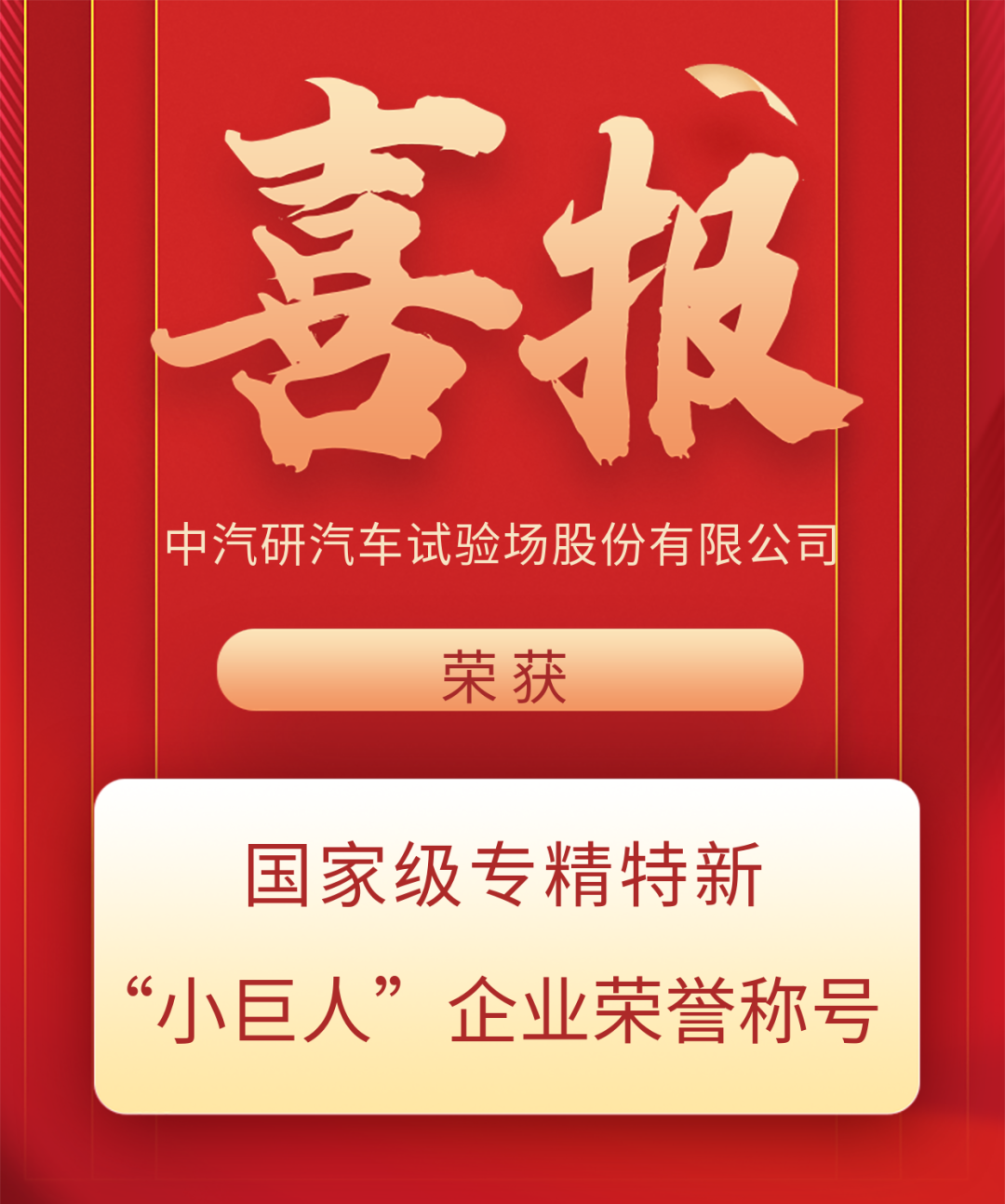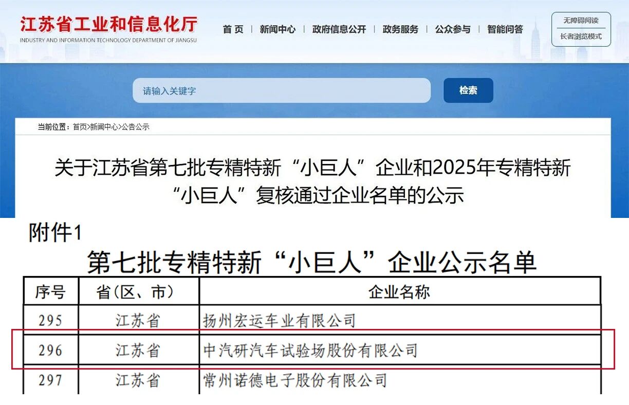 近日,根据工业和信息化部审核认定结果,江苏省工业和信息化厅发布了第七批专精特新“小巨人”企业公示名单,中汽研汽车试验场股份有限公司(以下简称“中汽股份”)凭借在汽车试验场领域突出的自主创新能力和核心竞争力成功上榜,荣获国家级专精特新“小巨人”企业荣誉称号。