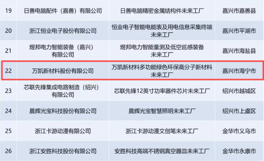 近日,浙江省经济和信息化厅关于2025年浙江省未来工厂试点企业名单正式公布,万凯新材凭借在数字化转型领域的扎实积累与创新实践,成功入选名单,标志着公司智能制造发展水平获得省级权威认可。