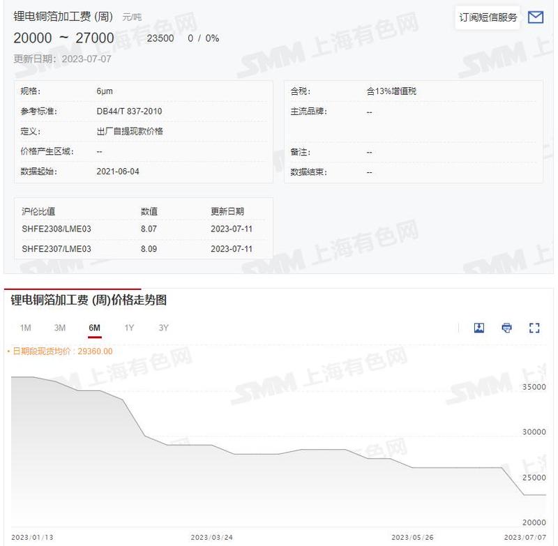 从SMM锂电铜箔加工费6μm(周)报价的历史走势来看,进入2023年,其均价以36500元/吨的价格平稳开局,这一价格一直平稳的持续到1月20日当周,进入2月3日当周,其均价便开启了今年上半年的整体下跌之路,其均价仅在4月21日当周出现了500元/吨的价格上调,随后又继续下调。进入5月下旬随着新能源汽车等需求回暖的刺激,锂电铜箔加工费有止跌企稳的迹象。不过,临近7月,随着电厂招标价格的走低,以及进入三四季度新增产能的陆续投产,锂电铜箔加工费出现了继续下行的迹象。6月30日,据SMM报价显示,SMM锂电铜箔加工费6μm(周)的报价为20000~27000元/吨,平均价为23500元/吨,其均价较前一周的均价26500元/吨,下跌3000元/吨,跌幅为11.32%;与今年年初36500元/吨的均价相比,更是下跌了13000元/吨,跌幅为35.62%。7月7日,SMM锂电铜箔加工费6μm(周)的报价为20000~27000元/吨,平均价为23500元/吨,其均价较前一周(6月30日)的均价持平。