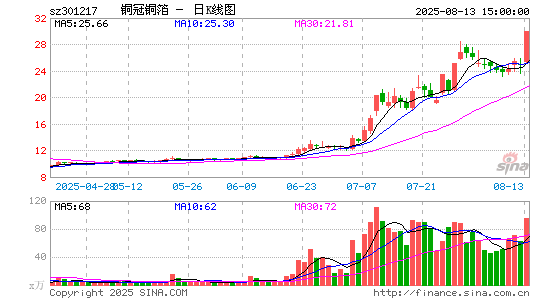 周三,工业金属板块大涨3.27%,个股方面,铜冠铜箔(301217)收获“20CM”涨停,股价创上市以来新高。从盘面上看,铜冠铜箔13日早盘高开1.48%,开盘后,该股展开强势震荡;午后,该股成交量明显放大,在大笔买盘推动下,该股快速上涨并封住涨停。截至收盘,该股上涨20.02%,报收于29.92元/股,成交额为25.5亿元,换手率为11.42%。