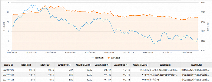 亚香股份7月25日大宗交易成交158.39万股,成交额5366.25万元,占当日总成交额的57.51%,成交均价33.88元,较市场收盘价折价1.51%,其中最高成交价34.7元,最低成交价32.1元。
