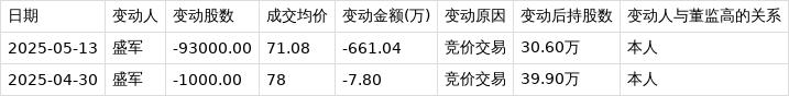 深交所公开信息显示,5月13日,亚香股份董秘、董事、高管盛军在竞价交易公司股票,减持股数9.30万股,成交均价71.08元,变动金额661.04万元,变动后持股数为30.60万股。