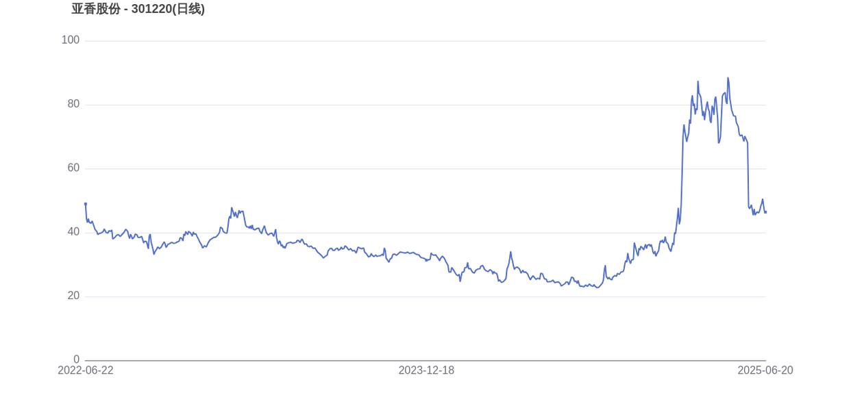 从上市首日至今,亚香股份的市值实现了32%的增长。2025年4月22日,亚香股份的市值巅峰达到72.72亿元,股价也顺应升至90.0元。而至6月20日收盘,亚香股份的股价为46.4元,市值为52.33亿元,相比峰值时期市值减少20.39亿元,市值蒸发了28.04%。