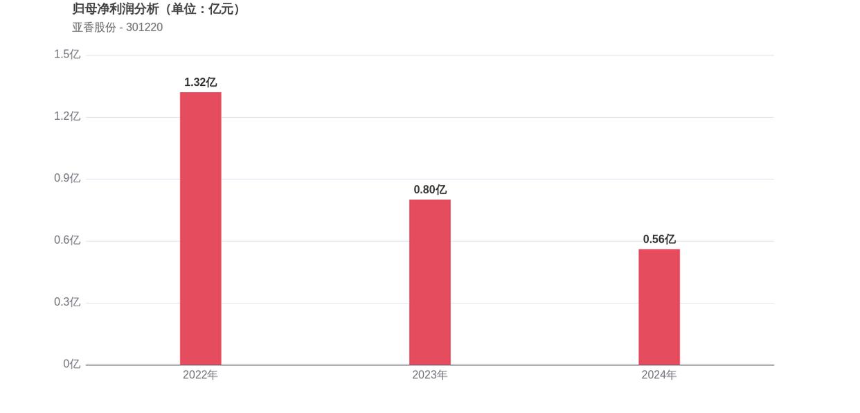 亚香股份上市的2022年,当年实现归母净利润1.32亿元,截至最新完整财年的2024年,公司实现0.56亿元的归母净利润,累计利润下降了57.73%。这3个年间,亚香股份无一年份出现亏损,归母净利润增长的年份达到1年,占比高达33.33%。从最近年份的财报看出,公司盈利能力持续承压。