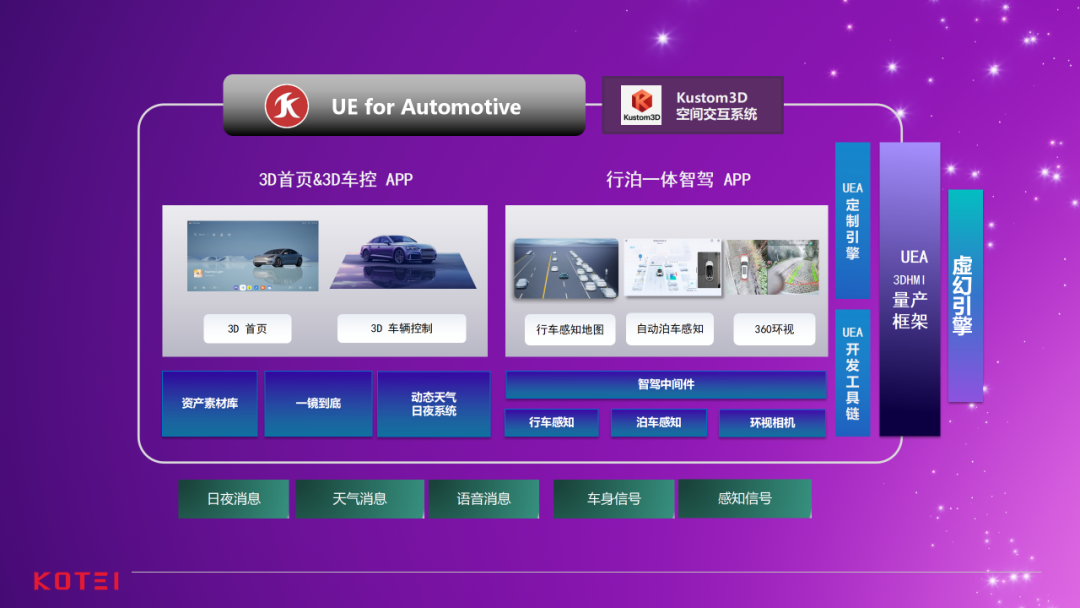 经过多个量产项目的持续打磨,在虚幻引擎官方团队的支持下,光庭信息构建了面向汽车行业的定制化解决方案——UE for Automotive(UEA)。该方案是基于虚幻引擎自主研发,面向车载座舱应用场景,覆盖当前3D座舱各类需求场景,致力于为智能汽车高效构建沉浸式、娱乐化的新一代座舱交互体验。
