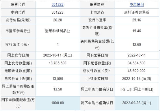 中荣股份2022年10月10日披露的首次公开发行股票并在创业板上市发行公告显示,按本次发行价格26.28元/股,预计公司募集资金总额约为126,932.40万元,扣除预计发行费用约为9,649.74万元(含增值税)后,预计募集资金净额约为117,282.66万元。