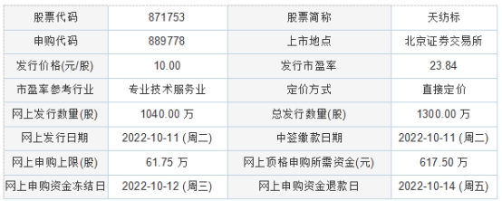 天纺标2022年9月29日披露的向不特定合格投资者公开发行股票并在北京证券交易所上市发行公告显示,超额配售选择权实施前本次发行预计募集资金总额为13,000.00万元,若全额行使超额配售选择权本次发行预计募集资金总额为14,950.00万元。