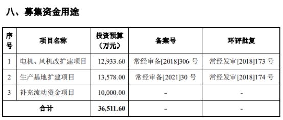 祥明智能本次发行募集资金总额5.04亿元,扣除发行费用后,募集资金净额为4.38亿元。祥明智能最终募集资金净额比原计划多7255.29万元。祥明智能于2022年3月9日披露的招股说明书显示,公司拟募集资金3.65亿元,分别用于“电机、风机改扩建项目”、“生产基地扩建项目”、“补充流动资金项目”。