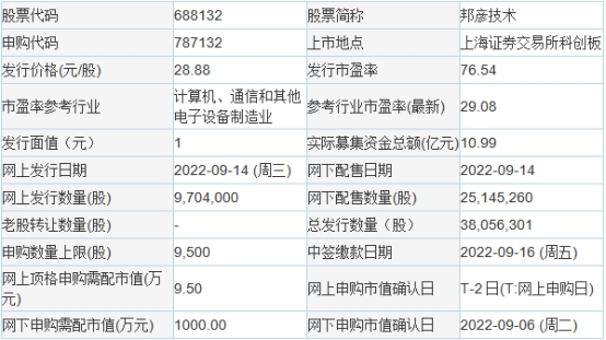 邦彦技术2022年9月13日披露的首次公开发行股票并在科创板上市发行公告显示,公司本次募投项目预计使用募集资金金额为80,241.30万元。按本次发行价格28.88元/股和3,805.6301万股的新股发行数量计算,若本次发行成功,预计公司募集资金总额109,906.60万元,扣除约12,484.63万元(不含税)的发行费用后,预计募集资金净额97,421.97万元(如有尾数差异,为四舍五入所致)。