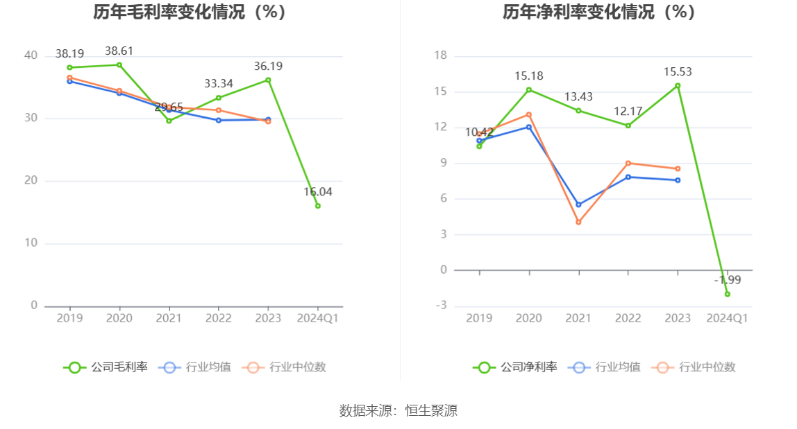 2024年第一季度,公司毛利率为16.04%,同比下降10.28个百分点;净利率为-1.99%,较上年同期上升4.54个百分点。