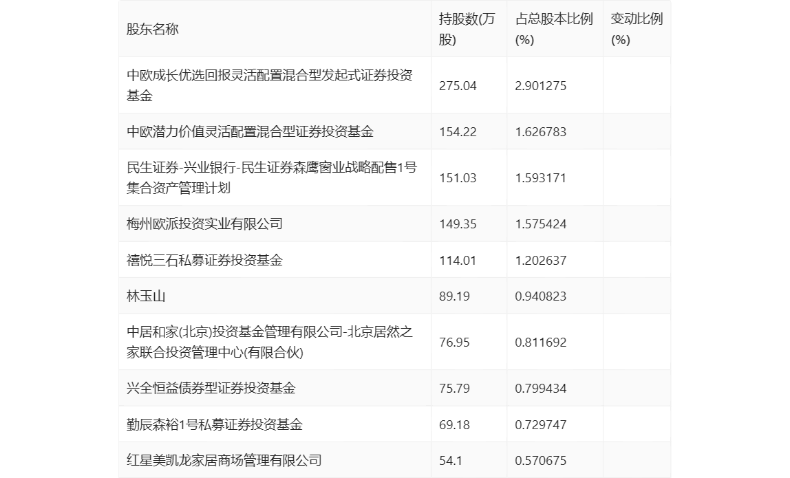 一季报显示,2024年一季度末公司十大流通股东中,新进股东为禧悦三石私募证券投资基金,取代了上年末的邱东。在具体持股比例上,中欧成长优选回报灵活配置混合型发起式证券投资基金、中欧潜力价值灵活配置混合型证券投资基金、勤辰森裕1号私募证券投资基金持股有所上升,梅州欧派投资实业有限公司、林玉山、中居和家(北京)投资基金管理有限公司-北京居然之家联合投资管理中心(有限合伙)、兴全恒益债券型证券投资基金、红星美凯龙家居商场管理有限公司持股有所下降。
