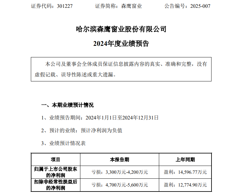 森鹰窗业预计2024年归属于上市公司股东的净利润亏损3300万元-4200万元;扣除非经常性损益后的净利润亏损4700万元-5600万元。