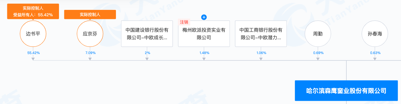 据显示,目前,边书平是森鹰窗业的法定代表人和实际控制人,其作为第一大股东直接持股55.42%,另有自然人应京芬直接持股7.09%,位列第二大股东,两人同为森鹰窗业的实际控制人。