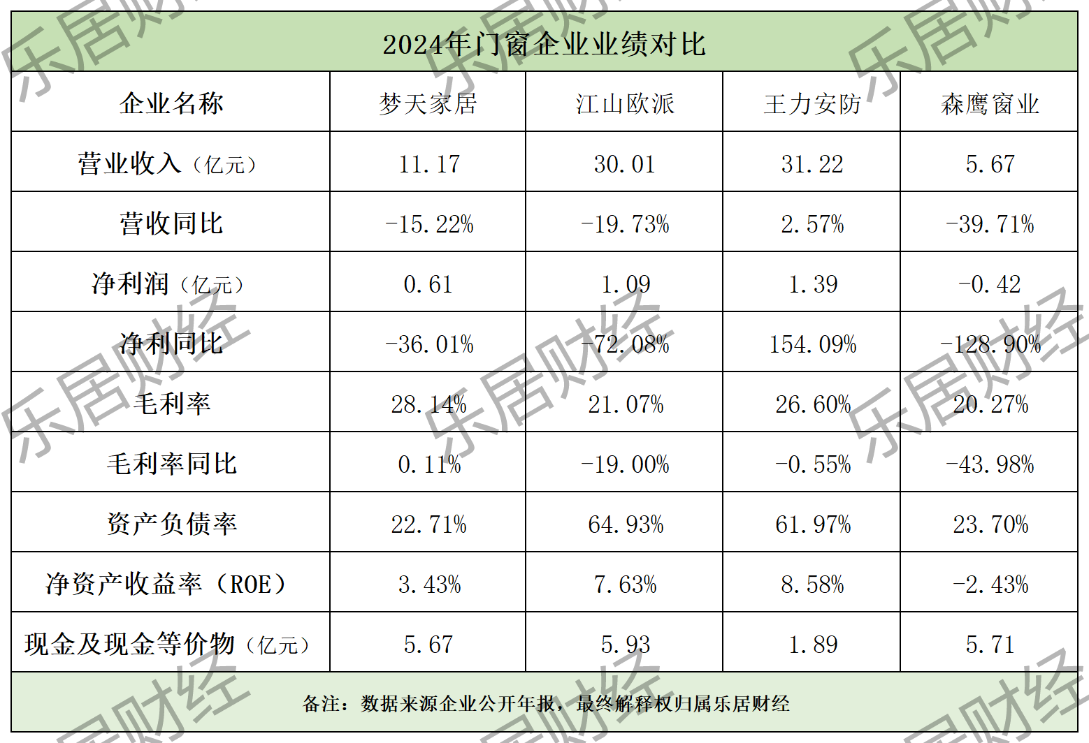 王力安防、江山欧派、梦天家居实现归母净利润为1.39亿元、1.09亿元、0.61亿元,而森鹰窗业出现亏损,归母净利润为-0.42亿元。