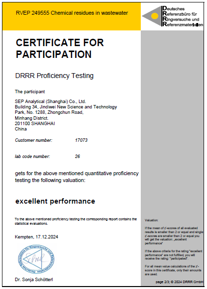 近日,实朴检测技术(上海)股份有限公司参加的由德国DRRR组织的“废水中化学残留物质(DRRR-Proficiency Testing RVEP 249555 Chemical residues in wastewater)”的国际能力验证中,获得“优异(excellent performance)”的评价结果。