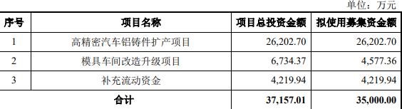 本次向不特定对象发行可转换公司债券募集资金总额不超过人民币35000万元(含本数),扣除发行费用后将全部用于高精密汽车铝铸件扩产项目、模具车间改造升级项目、补充流动资金。