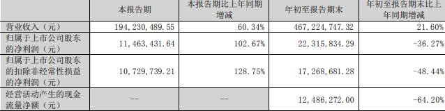 今年前三季度,公司实现营业收入4.67亿元,同比增长21.60%;实现归属于上市公司股东的净利润2231.58万元,同比减少36.27%;实现归属于上市公司股东的扣除非经常性损益的净利润1726.87万元,同比减少48.44%;经营活动产生的现金流量净额为1248.63万元,同比减少64.20%。