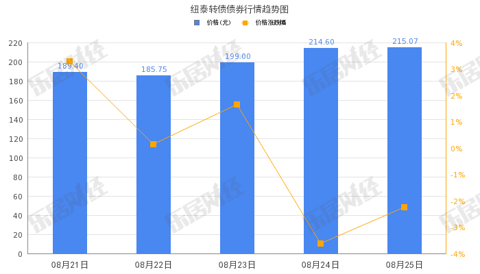 乐居财经 08月28日,“纽泰转债”(123201)早盘拉高,截至10:10,涨幅20%,报258.08元。总成交量19.32万手,成交额4.77亿元。