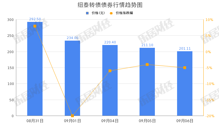 09月07日,“纽泰转债”(123201)下午盘拉低,截至15:10,跌幅10.03%,报180.94元。总成交量27.56万手,成交额5.16亿元。
