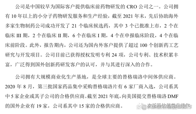 公司是一家新药研发以及商业化生产一站式综合服务商,致力于药物发现,制药工艺的研究开发以及原料药中间体的商业化生产,公司新药研发服务涵盖临床前新药研究的全过程,主要包括药物发现和工艺研究与开发服务。医药中间体公司,报告期内业绩保持快速增长,新药研发环境不断改善,药物审评加速,国内CRO市场快速发展,未来有一定的相信空间,注意的是与同行业相比,公司的营收规模和技术水平以及毛利率都没有优势,盘子不大,给予申购建议。
