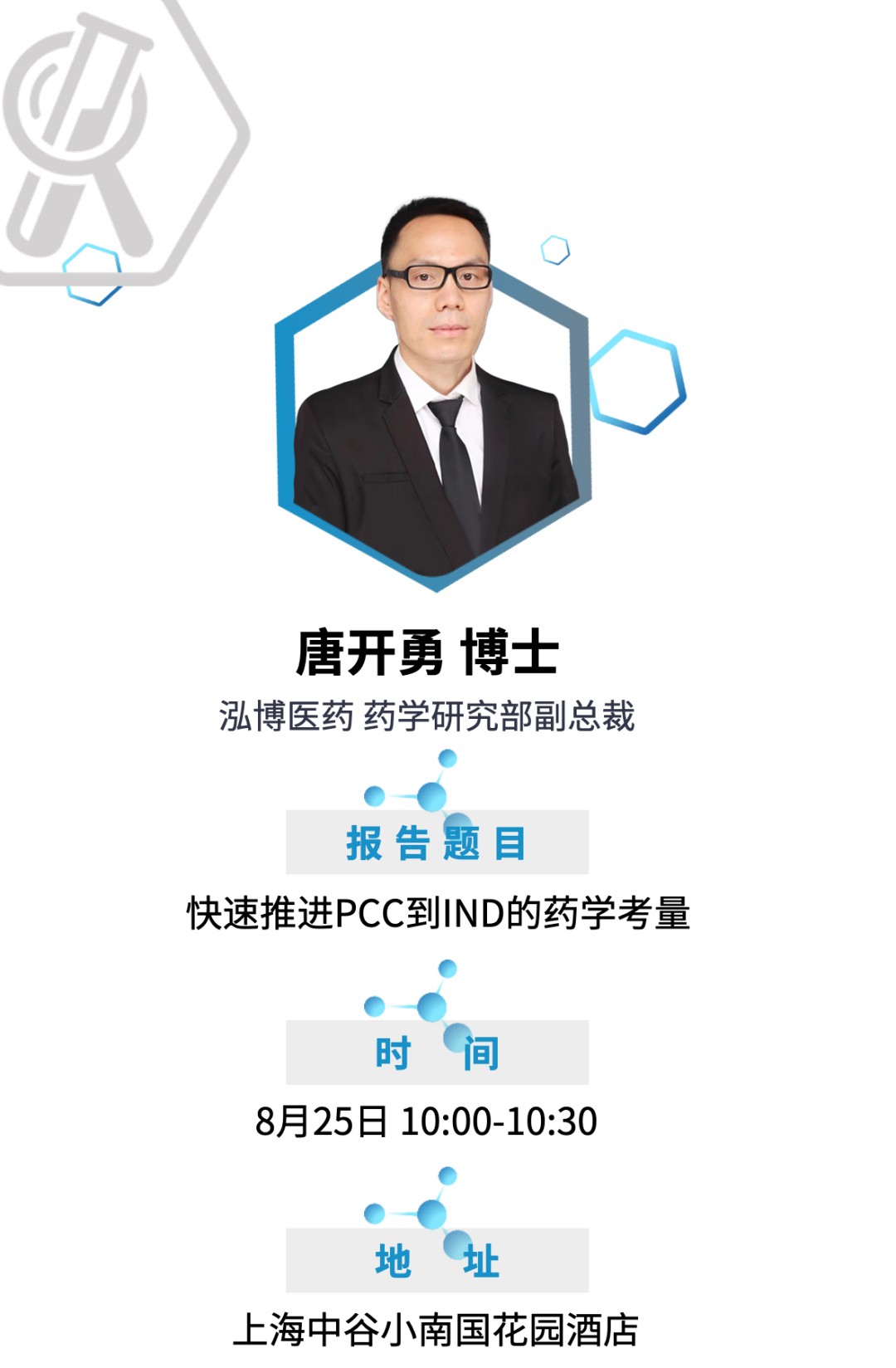 作为参会商之一,泓博医药药学研究部副总裁唐开勇博士将出席小分子创新药开发与合作论坛并做主题演讲:《快速推进PCC到IND的药学考量》。同时,我们将在活动现场设有展位(展位号:#8)欢迎大家关注及莅临展位交流。