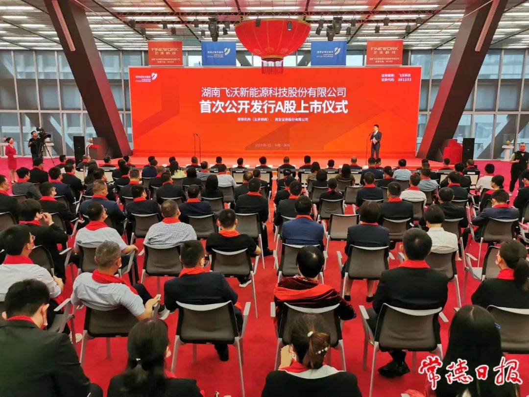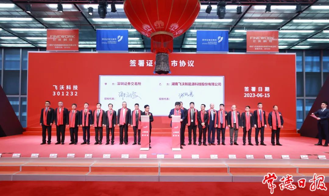 6月15日上午,湖南飞沃新能源科技股份有限公司(以下简称“飞沃科技”)首次公开发行A股上市仪式举行。飞沃科技(股票代码:301232)在深圳证券交易所创业板成功上市,这是常德第一家制造业上市公司。市委书记曹志强致辞并为飞沃科技敲响开市宝钟。