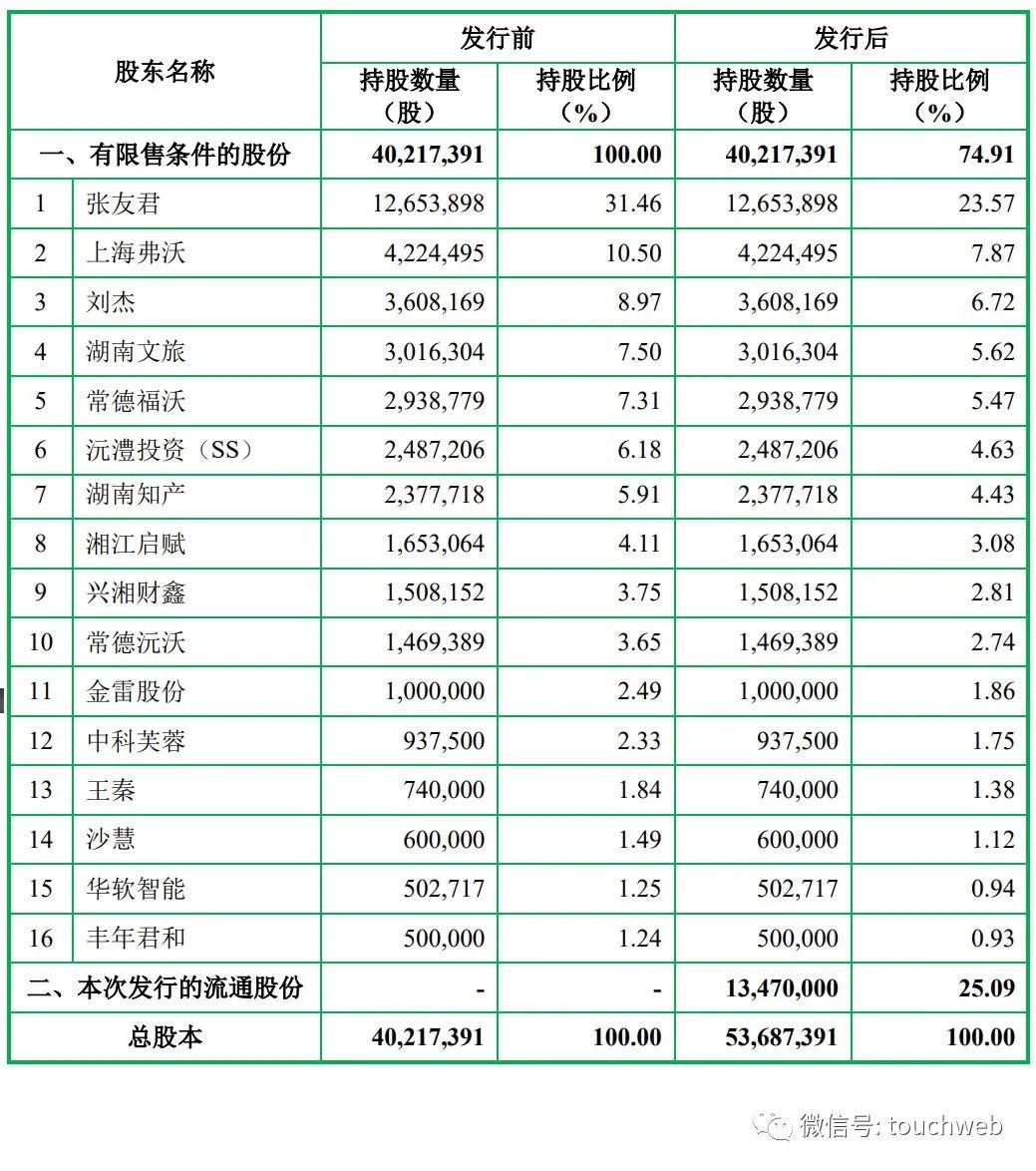 IPO后,张友君持股为23.57%,上海弗沃持股为7.87%,刘杰持股为6.72%,湖南文旅持股为5.62%,常德福沃持股为5.47%,沅澧投资(SS)持股为4.63%,湖南知产持股为4.43%。