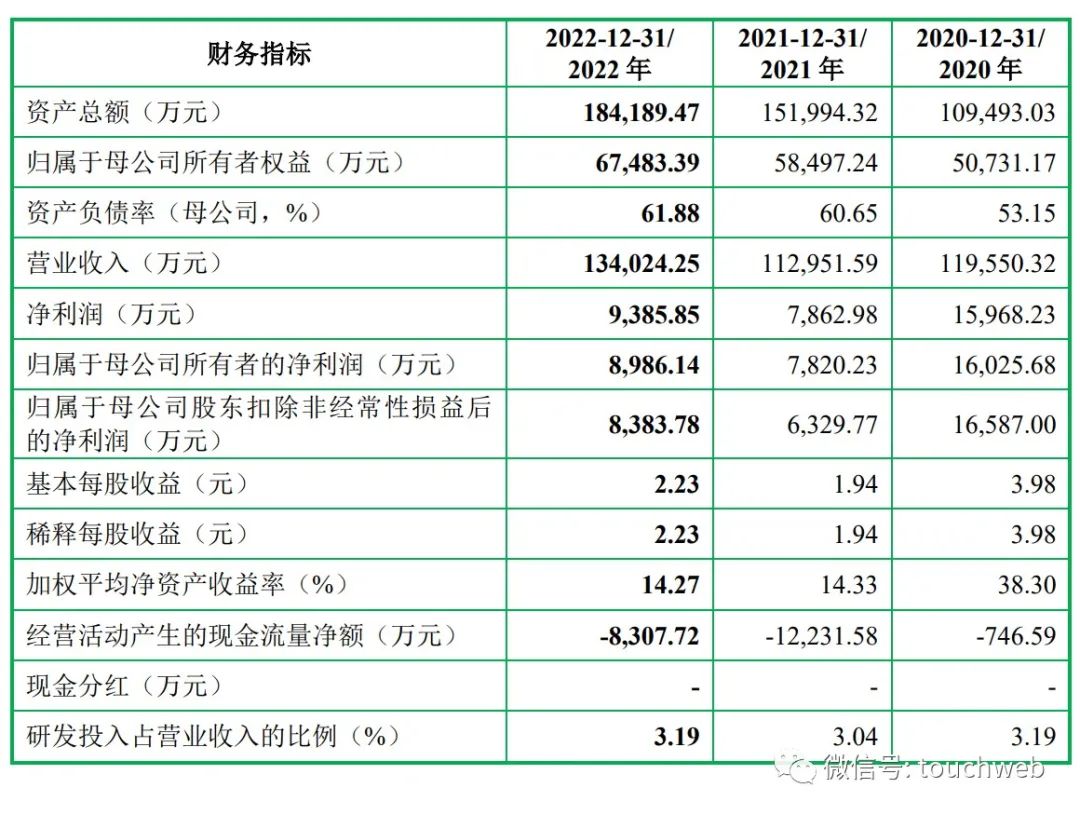 招股书显示,飞沃科技2020年、2021年、2022年营收分别为11.96亿元、11.3亿元、13.4亿元;净利分别为1.6亿元、7862.98万元、9385.85万元;扣非后净利分别为1.66亿元、6329.77万元、8383.78万元。