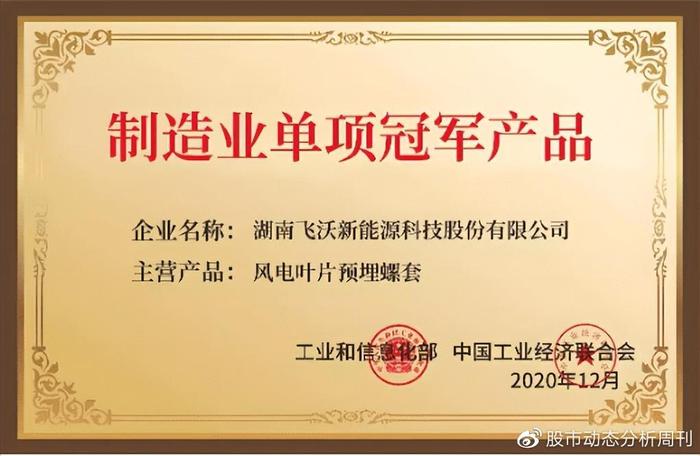 在风电领域,飞沃科技经过近十年的发展,已成长为全球风电高强度紧固行业最重要的供应商之一。根据中国机械通用零部件工业协会出具的证明,飞沃科技生产的风电叶片预埋螺套2019年在所属单品细分市场的国内占有率达81.6%、全球占有率达70.8%,排名第一,并于2020年被工业和信息化部、中国工业经济联合会评选为第五批制造业单项冠军产品。