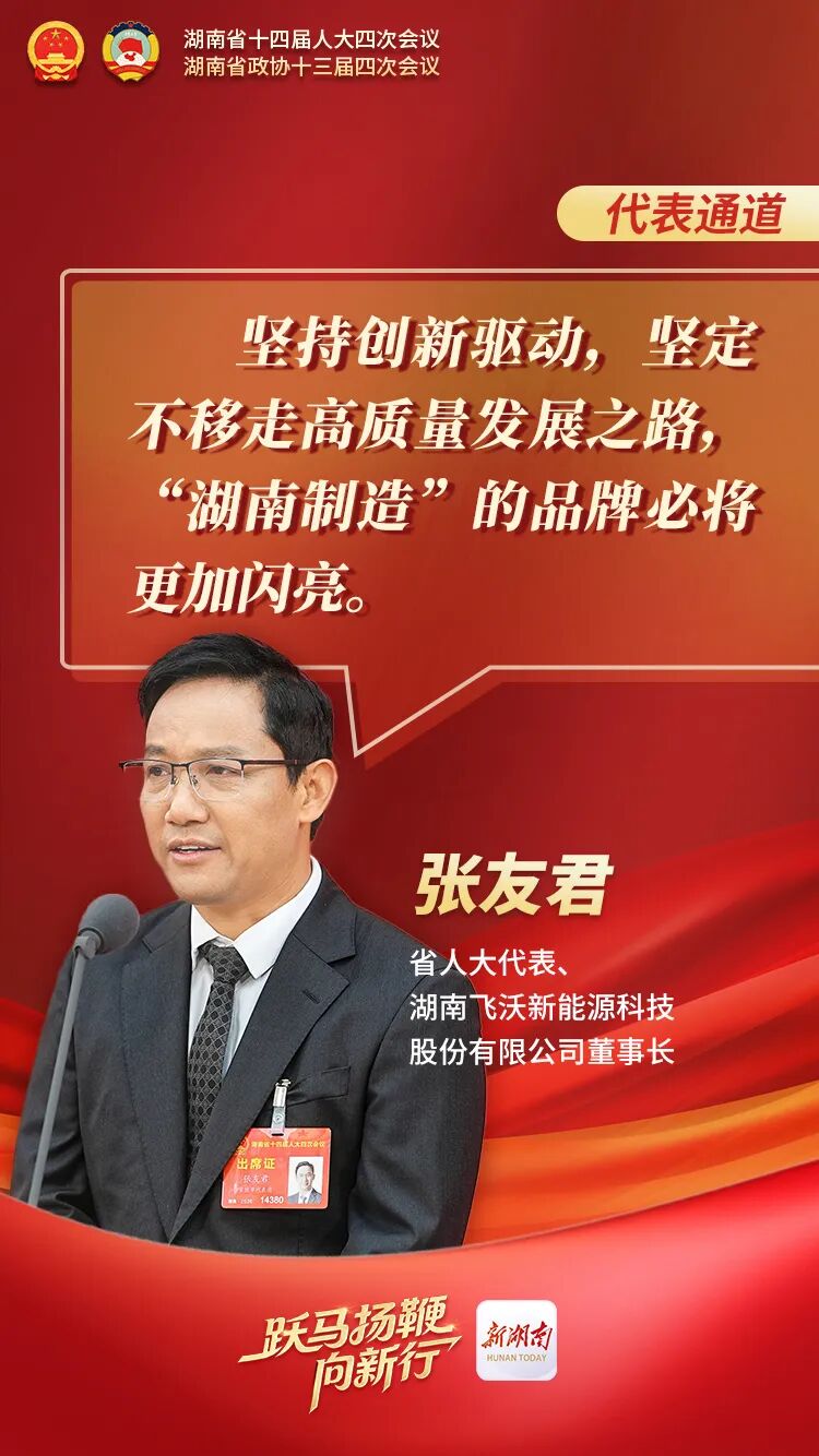 春潮涌动启新程,履职尽责正当时。近日,湖南省第十四届人民代表大会第四次会议隆重召开,湖南省人大代表、湖南飞沃新能源科技股份有限公司董事长张友君肩负使命、如约参会,积极投身两会履职实践,在代表团审议、代表通道等重要场合,结合企业发展实践与行业调研思考,为湖南制造业高质量发展、航空航天产业升级建言献策,传递民营企业家的责任与担当。