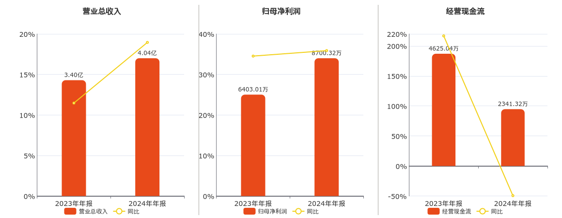 公司营业总收入为4.04亿元。归母净利润为8700.32万元。经营活动现金净流入为2341.32万元,较去年同报告期经营活动现金净流入减少2283.72万元,同比较去年同期下降49.38%。