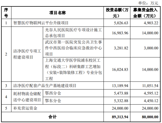 本次发行可转债募集资金总额(含发行费用)不超过人民币80,000.00万元(含本数),扣除发行费用后募集资金净额拟分别用于智慧医疗物联网云平台升级项目、洁净医疗专项工程建设项目、洁净医疗配套产品生产基地建设项目、耗材物流仓储配送中心建设项目、补充营运资金。