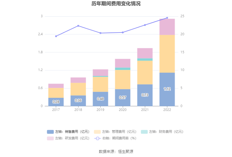 2022年全年,公司期间费用为2.93亿元,较上年增加9799.92万元;期间费用率为24.60%,较上年同期上升2.00个百分点。其中,销售费用同比增长53.11%,管理费用同比增长60.4%,研发费用同比增长59.22%,财务费用由上年同期的837.62万元变为-29.97万元。